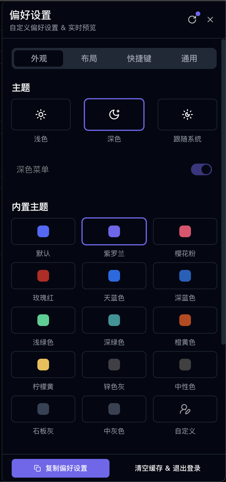 如果你找不到文档说明,可以尝试自己配置好以后,点击复制偏好设置,覆盖项目默认即可。配置文件位于应用目录下的preferences.ts,在这里,你可以覆盖框架默认的配置,实现自定义配置。